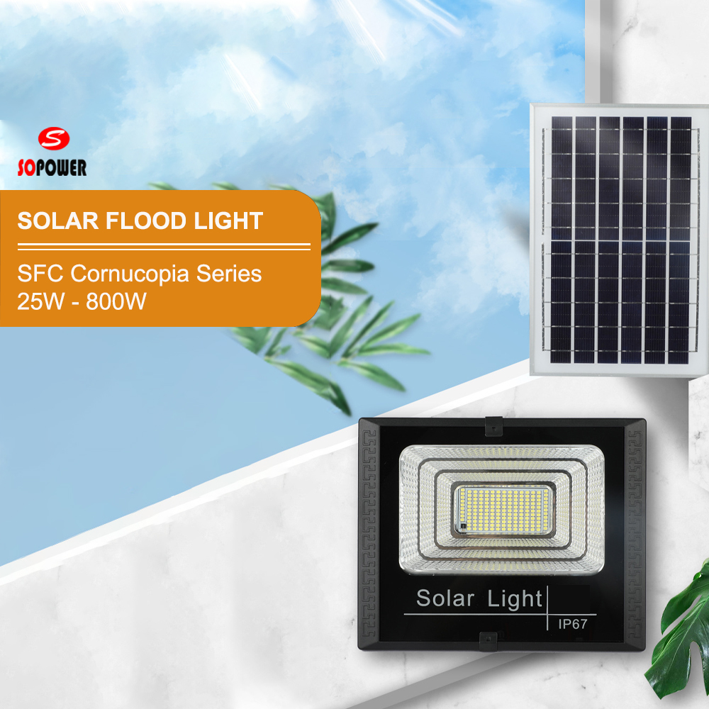 SFC Cornucopia Series 25W-800W solar flood light configures with high bright LED beads, A grade poly solar panel, high quality battery, remote control, auto charging, auto lighting.