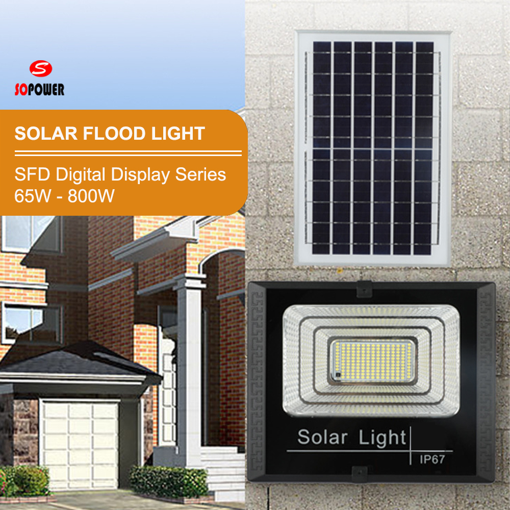 SFD Digital Display Series 65W-800W solar flood light configures with high bright LED beads, A grade poly solar panel, high quality battery, remote control, auto charging, auto lighting.