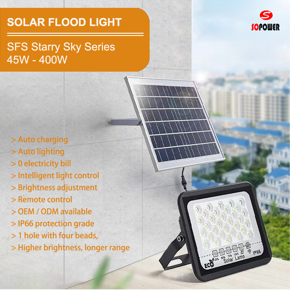 SFS Starry Sky Series 45W-400W solar flood light configures with hi-brightness four-core nanometre LED beads, A grade poly solar panel, high quality battery, remote control, 0 electricity bill.