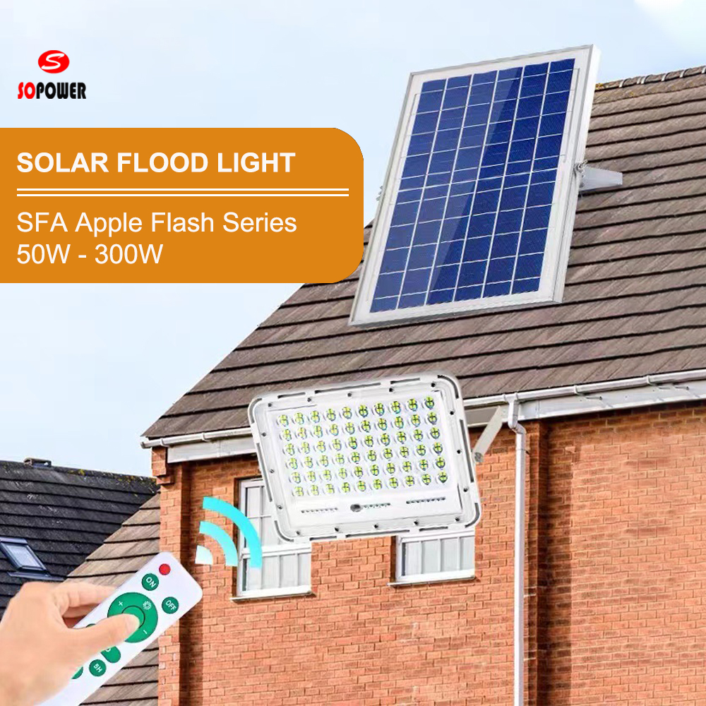 SFA Apple Flash Series 50W-300W solar flood light configures with Nanometre LED beads, A grade poly solar panel, high quality battery, remote control, 0 electricity bill, IP67 protection grade.
