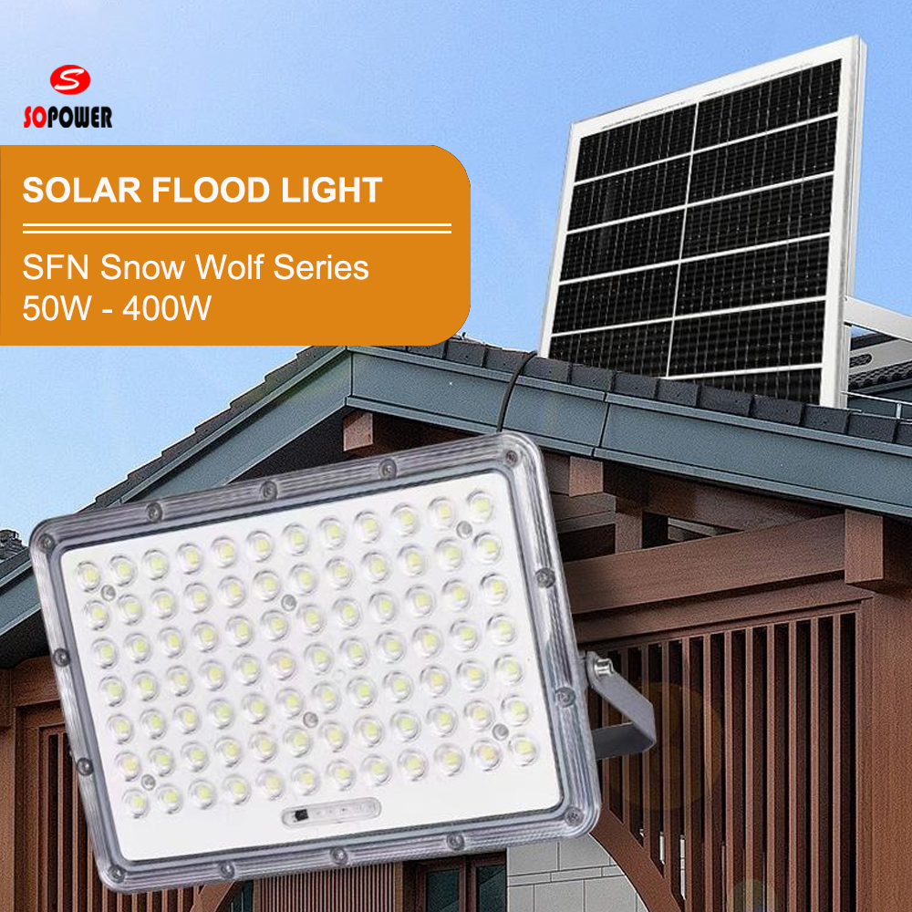 SFN Snow Wolf Series 50W-400W solar flood light configures with hi-light LED beads, A grade poly solar panel, high quality battery, remote control, IP65 waterproof and lighting proof.